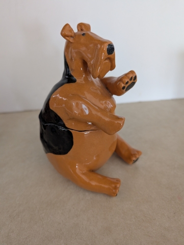 Totally unique and whimsical , this 2 piece ceramic Airedale jar is a rare find The jar is 7" tall. S Q and 2001 on the bottom. Donated by Mary Ellen Estes.