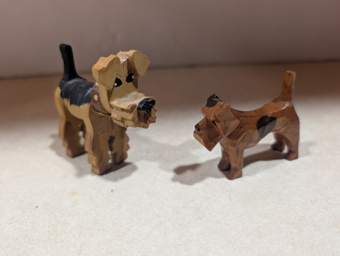 2 unique wooden Airedales make a perfect addition to any collection. One is hand carved with a shiny finish. The other Airedale fashioned of interesting cuts of wood, so cute. They are each 2-1/2" high.