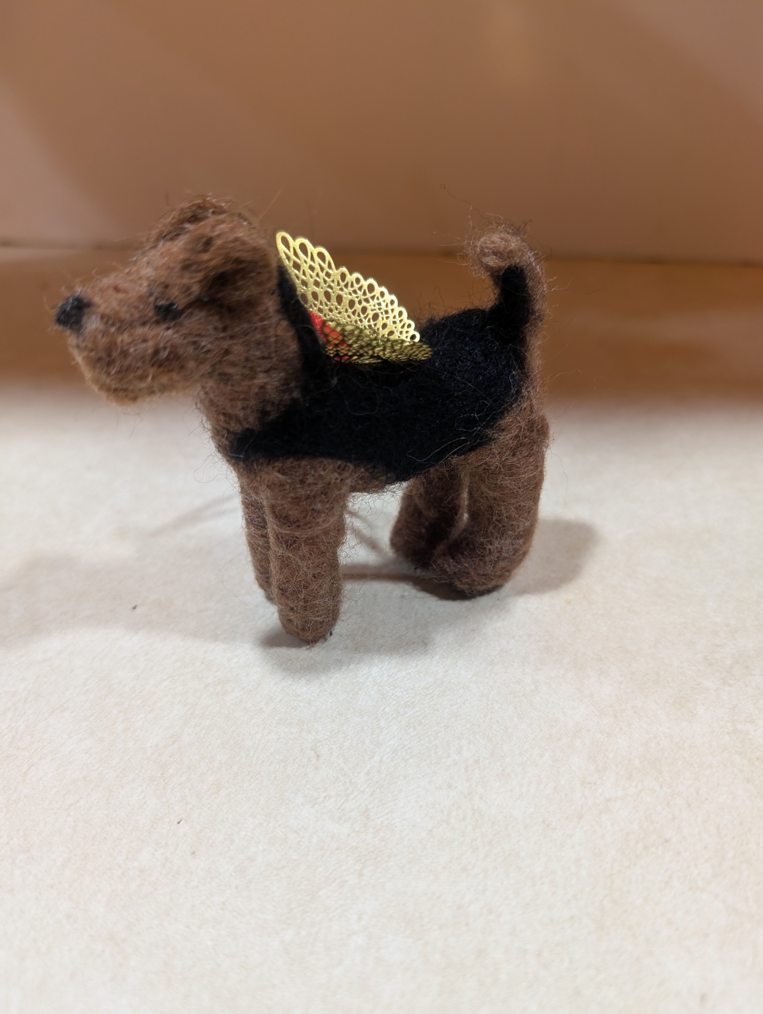 This 5" handmade needle felted Airedale ornament is wearing gold wings for the Christmas holidays and would look beautiful on a tree or alone standing. Great gift item!