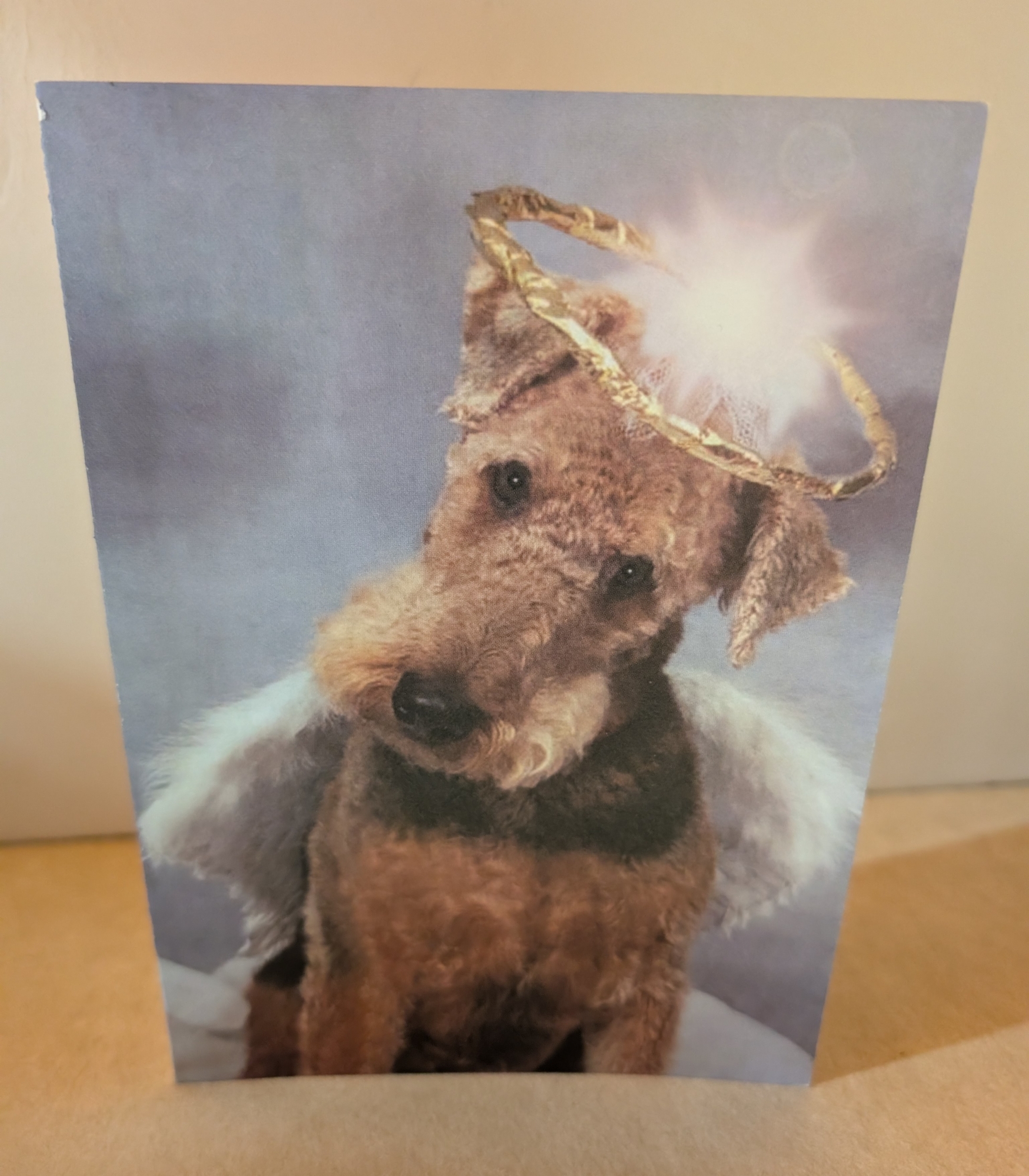What an adorable face for the Holidays! This precious Airedale face is sure to make the recipient smile. The inside sentiment reads" Bark the Airedale Angel sings" .