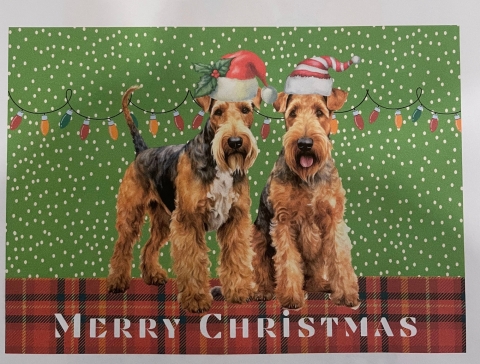 2 cute Airedales on the front of this card wish the recipient "Merry Christmas" . Inside sentiment reads "Santa Paws is coming to town. Let there be treats on earth.
