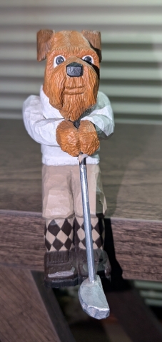 Completely adorable wooden golf sitter. Perfect gift for the golfer who has an Airedale , it measures 8 inches tall. Would look cute sitting on a shelf, the mantle, etc.