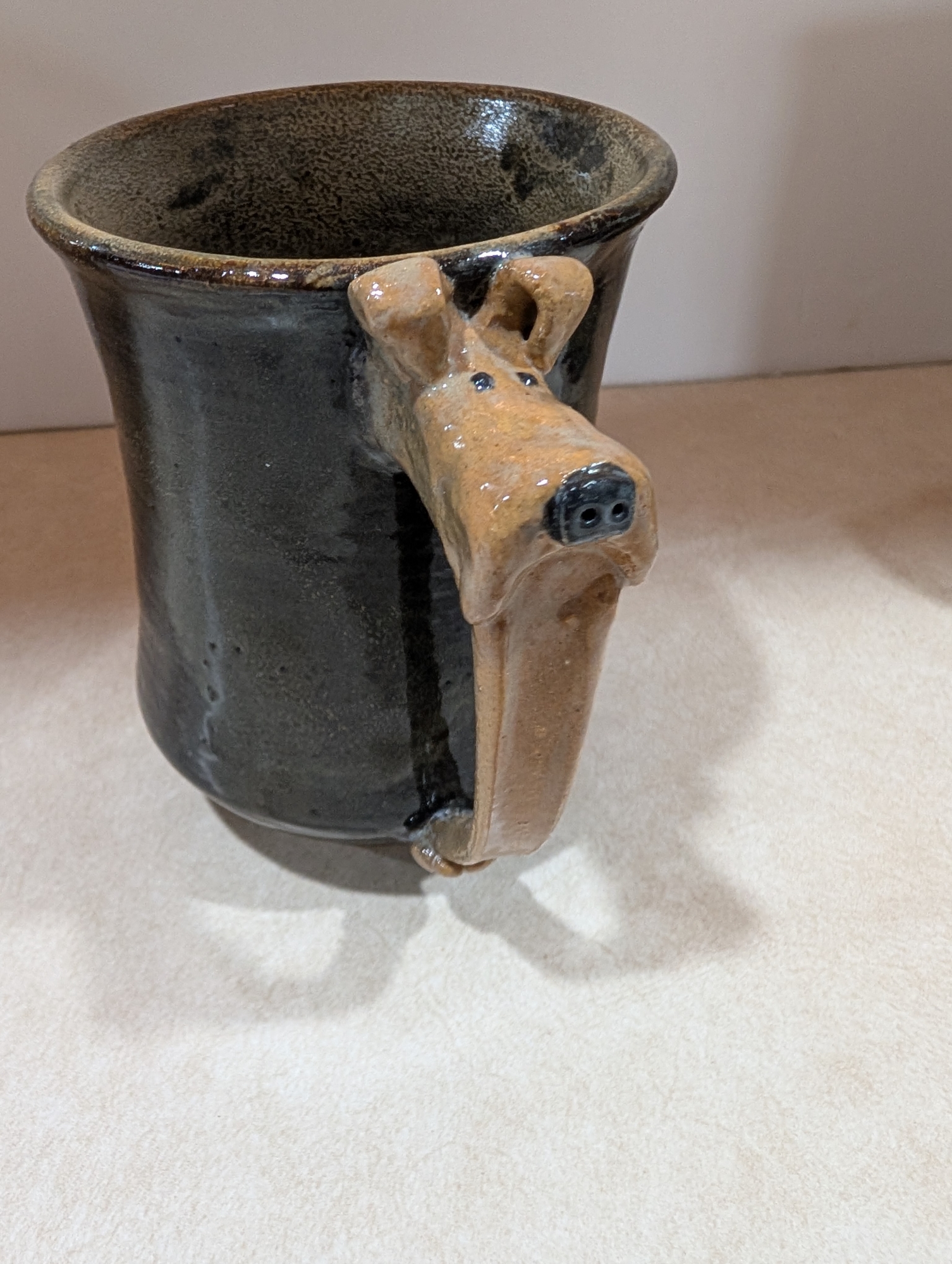 Get a firm hand on your Airedale! Airedale Mug that is. This ceramic mug has a very unique handle, an Airedale face. It measures 5" tall and makes a unique gift. Donated by Mary Ellen Estes