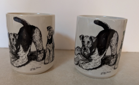 Coffee will be more enjoyable in these Airedale mugs! Featured on the pair of mugs is an Airedale Mom and 2 pups. They are made by The Cache.