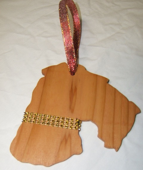 These wooden ornaments are each individually cut and handmade out of western red cedar. No two are alike, so if you are looking for a unique item to give to an Airedale lover, this is it!  Made and donated to ATRA by Marilyn Hughes in honor of all the seniors in rescue.  5" tall
