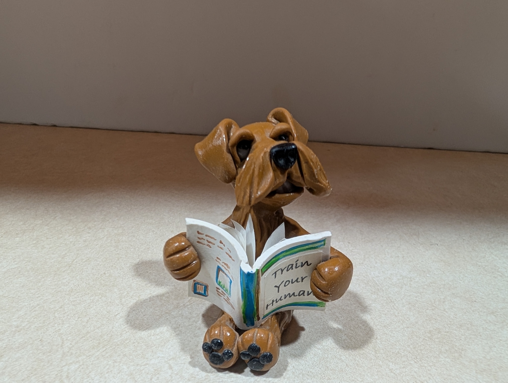 This is simply the cutest little Airedale ! He's reading a "Train your Human" manual, so very Airedale like , they train all their humans. He's 3" tall.
