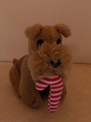 This cute little Airedale with a candy cane in his mouth is looking for a Christmas tree to call home for the Holidays. He is 3-1/2" high