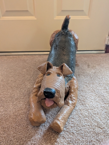 This completely unique handmade Airedale is a huge 22" long, 13"high and 8 "wide. He has an adorable face in the play bow position and would look festive with a Christmas bow. Not sure of the composition but could very well be polymer clay.