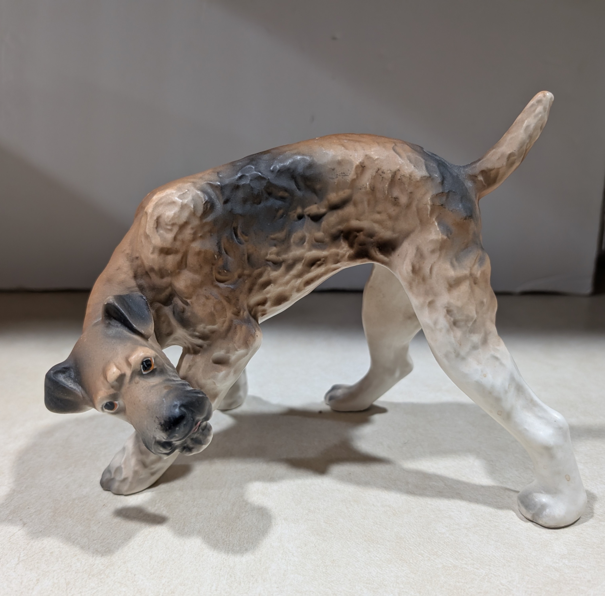 This vintage Airedale statue from the 40's is porcelain bisque and hand painted. . It is pictured in the ATRA poster" For the love of Airedales" which is sold in Annette's Airelooms gift shop . This statue measures 6" high and 8" long.