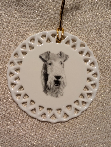 This porcelain 3-1/2 " Airedale ornament has beautiful edges to make it delicate in appearance. There's an Airedale face on each side.