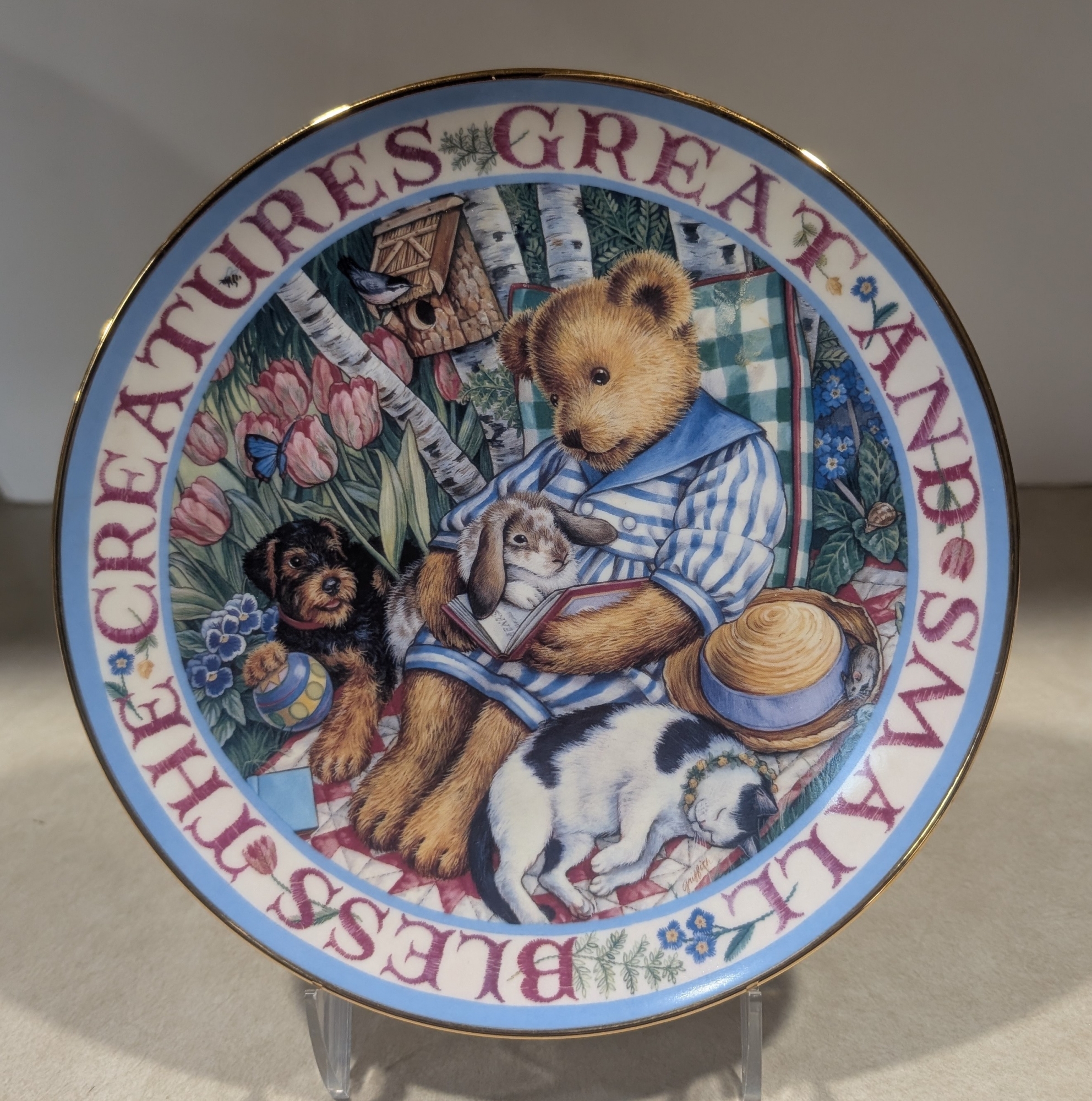 This is a beautiful Royal Doulton bone china plate in sentiment and appearance. "Bless the Creatures Great and Small" is stated on the edge along with 24 karat gold. It is 8-1/2" in diameter and number HA3463 of a limited edition from 1990's.