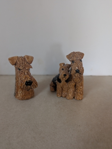 This ceramic duo consists of a young Airedale cuddled to its Mom . The other item could easily be a candle sniffer due to the indentation in the bottom or fit atop a candle. Each is 3-1/2" high.