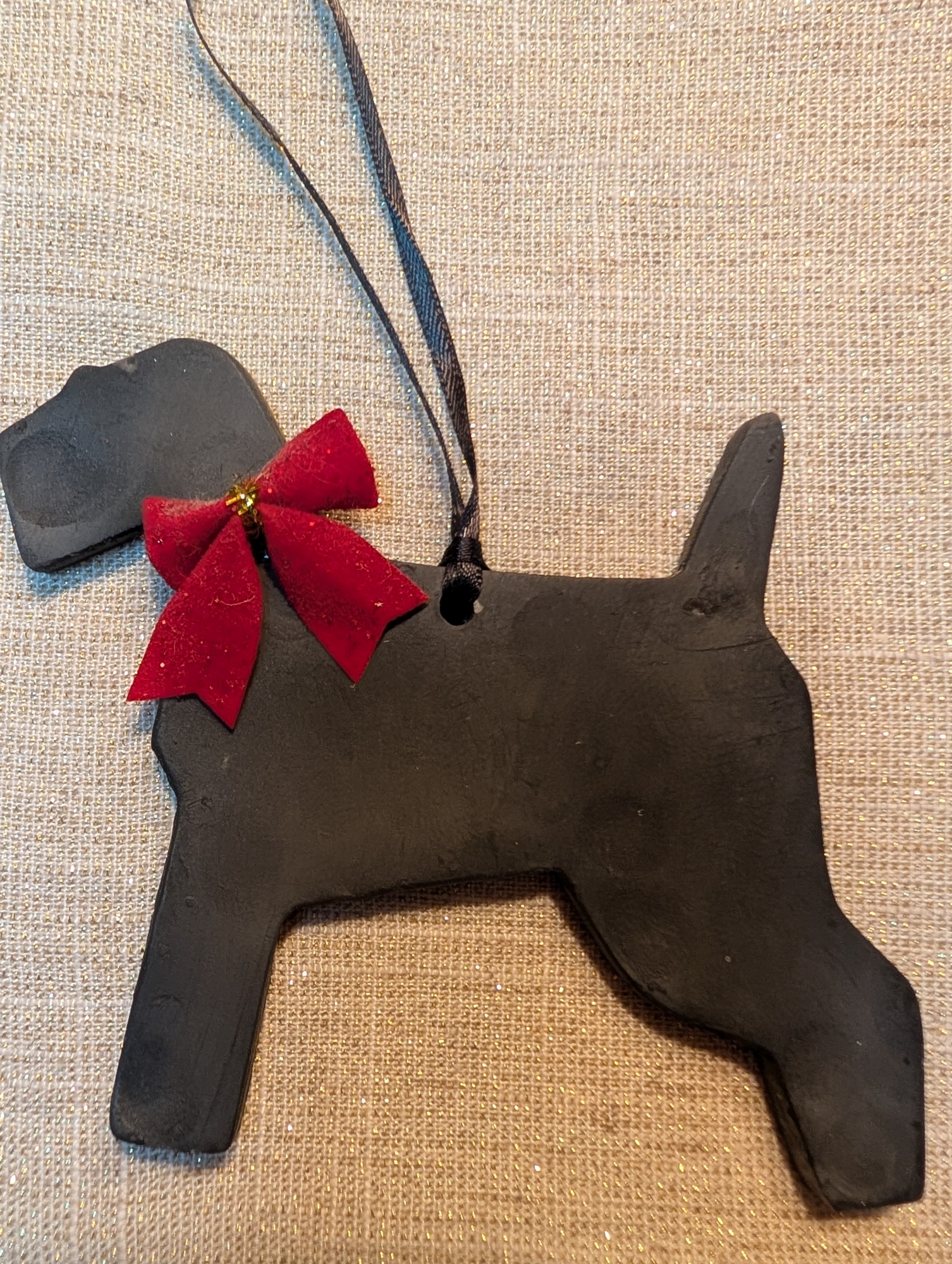 Beautiful clay ornament shaped like the perfect Airedale with a red bow.This ornament is 4-1/2" long and 4" tall.
