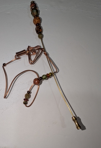 Truly a unique jewelry piece that can be worn on a jacket, sweater, hat, purse,etc. This custom made piece is fashioned with copper wire and complimented with green/tan/ brown beads. The stick pin is 7" long . The Airedale shaped head is 3 inches by 2.5 inches. Truly a unique and lovely piece.