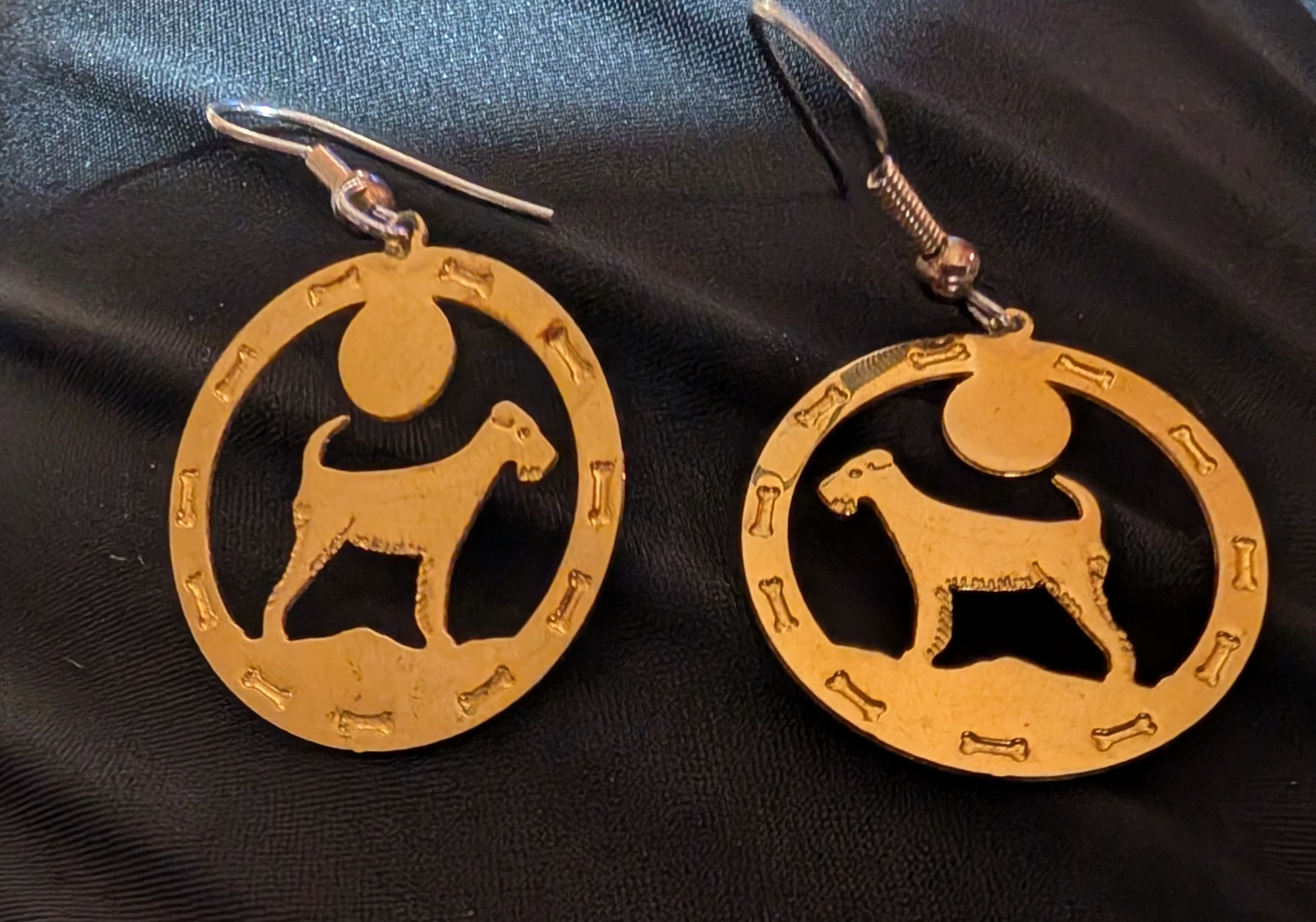 These gold tone earrings are very nicely designed. Circular in design with bone design around the outer edge and Airedale shape in the center. The circular portion is 1" in diameter.