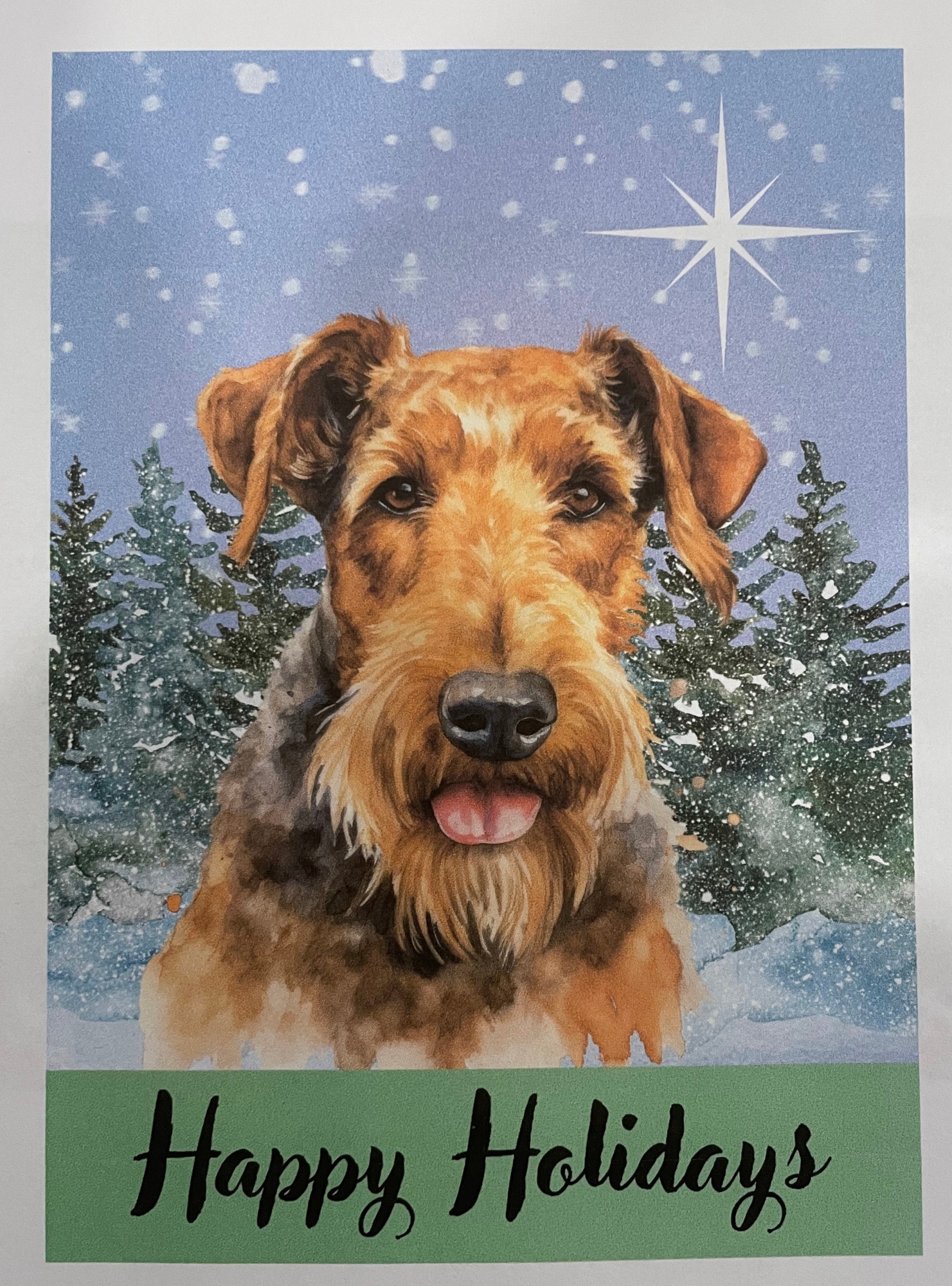 An adorable Airedale face wishes the recipient "Happy Holidays" . Inside sentiment reads "Wishing you warm and wonderful blessings during this most joyous time of year. Merry Christmas and Happy New Year." There are 5 cards with envelopes in this package. Graphics designed by Cindy Fluharty of Inn RETROspect.