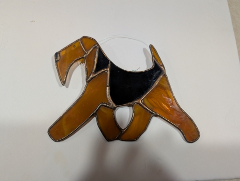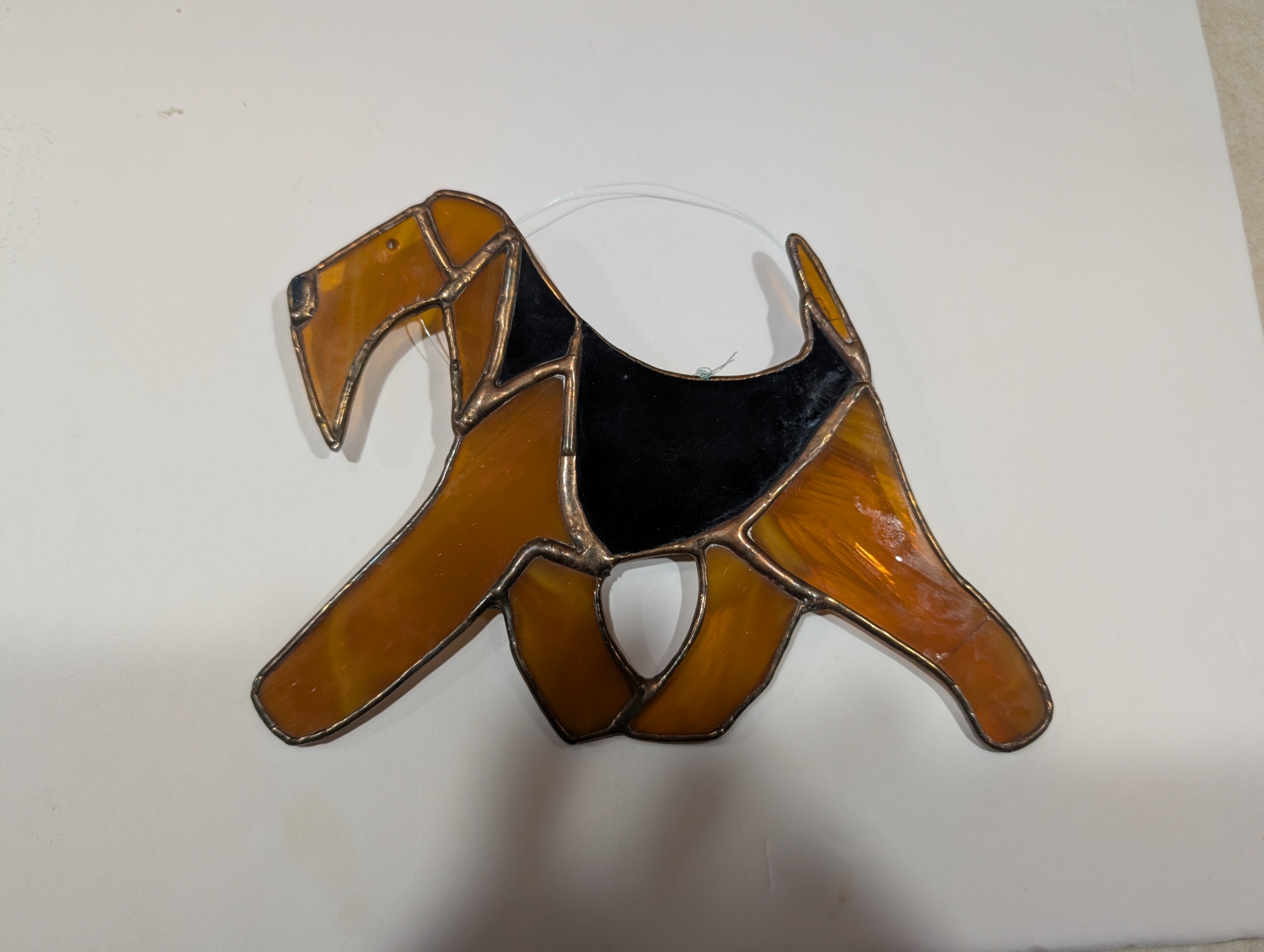 This finely hand made Leaded and Stained Glass Airedale would look outstanding in any window. The Airedale is perfectly made to show it's beautiful body while walking. The piece is 5-1/2" tall and 7" in length. Make someone's day special with this as a gift.