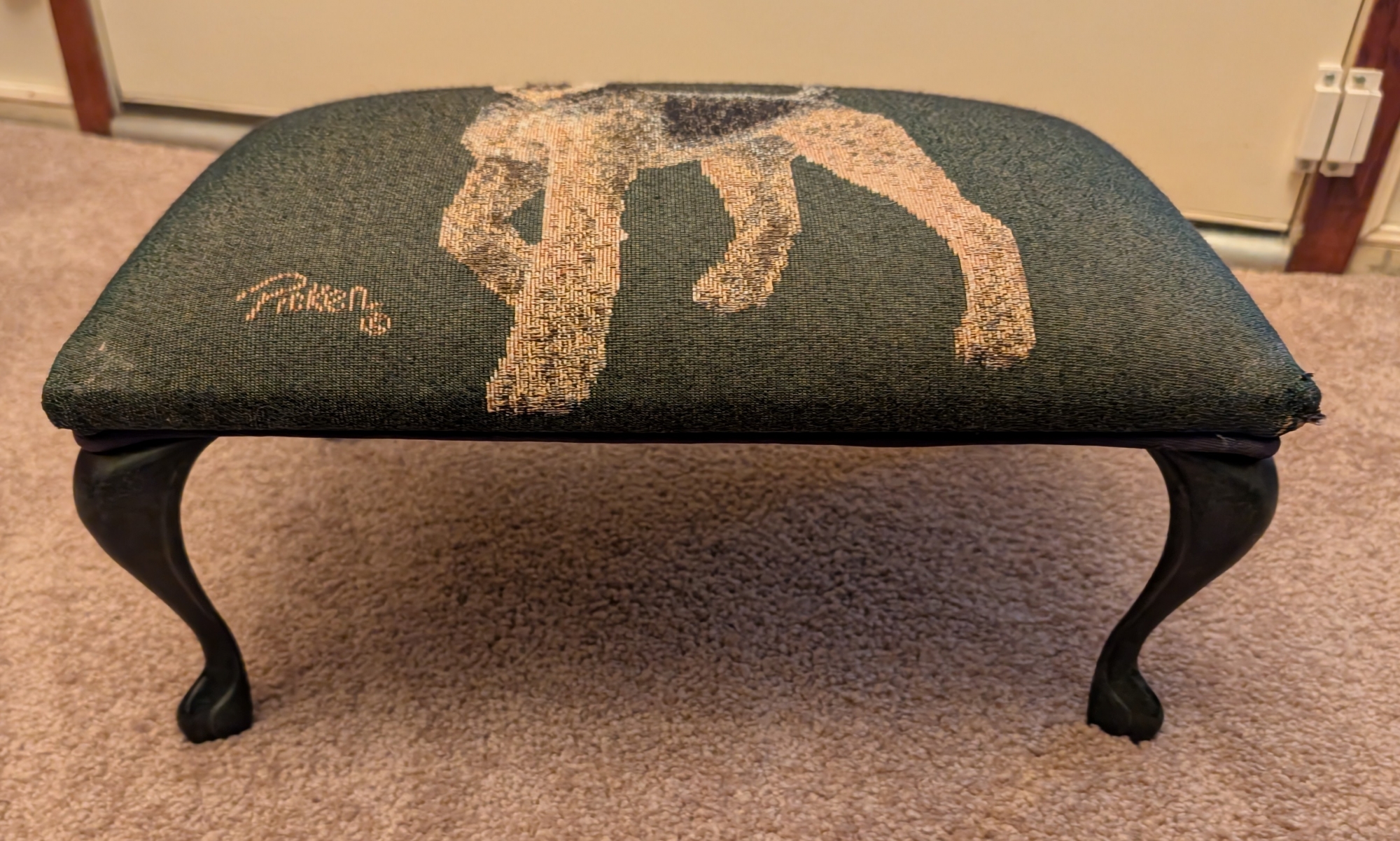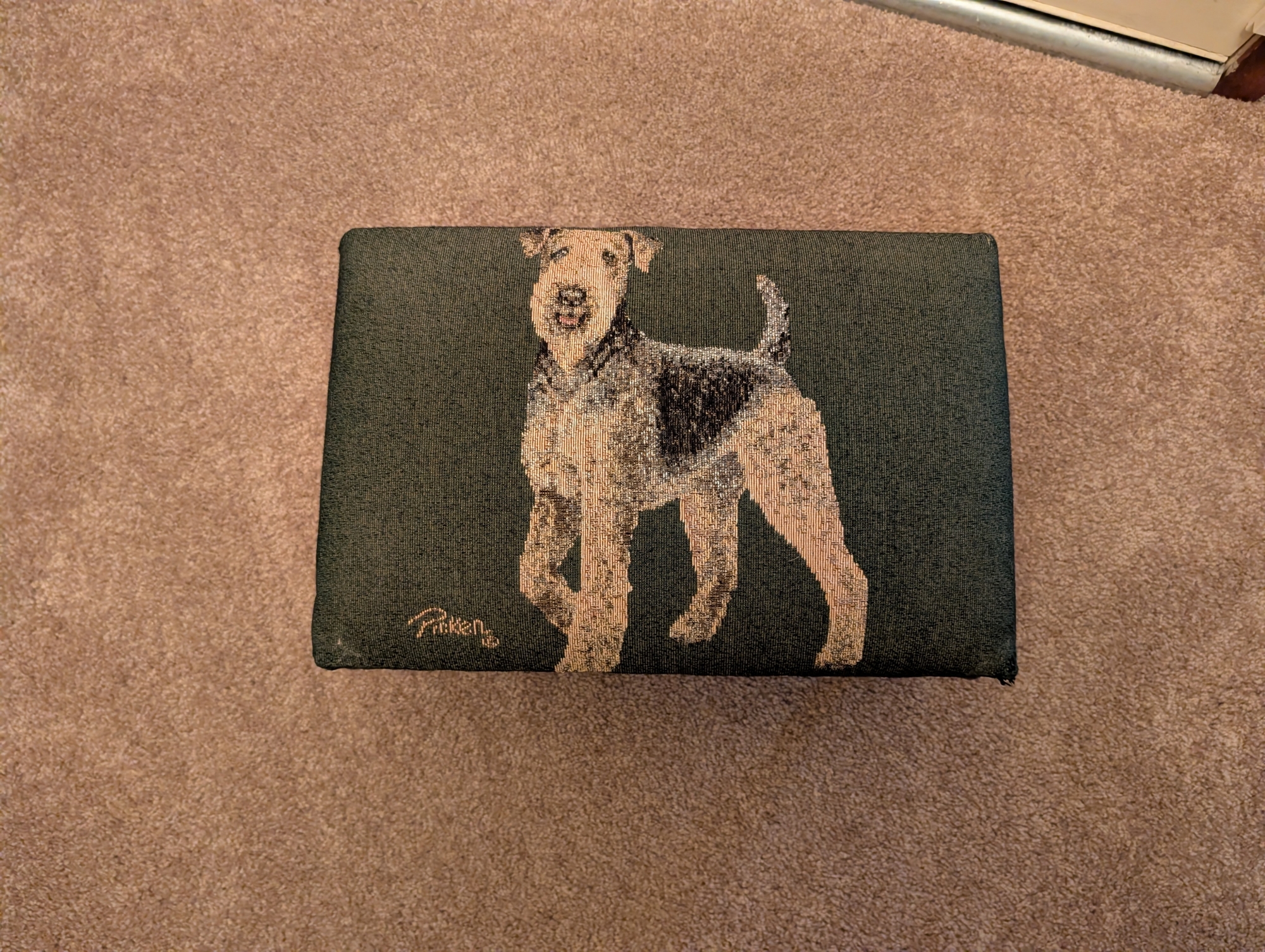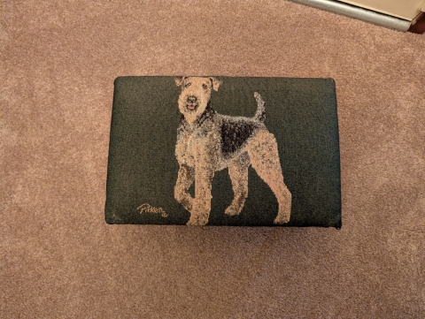 This is a very cute Linda Picken Tapestry Airedale footstool. It measures 15" by 10-1/2" by 7". The legs are black, French Provincial style .