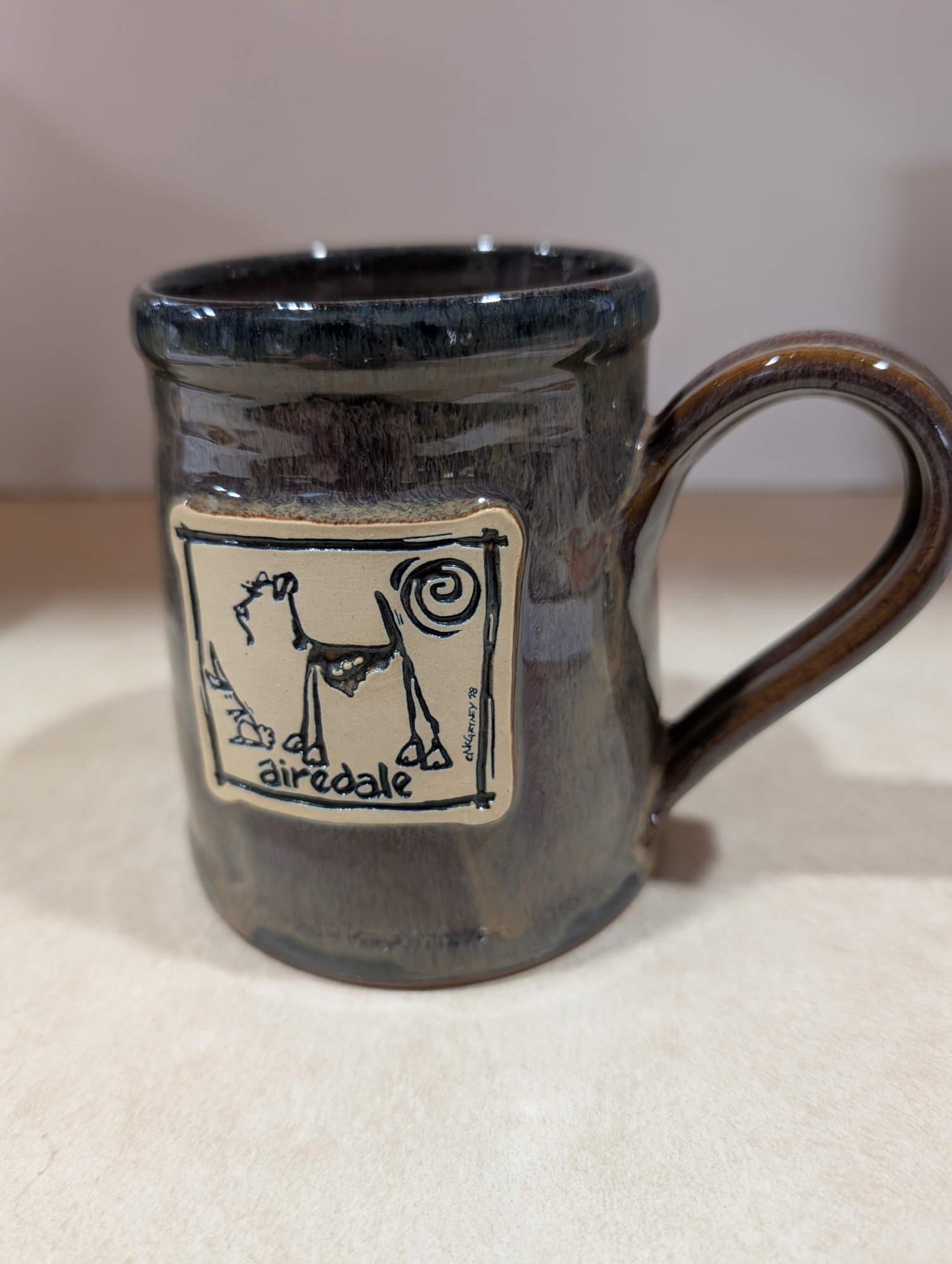 This is a rare vintage Stoneware Mug from Mike Cartney Art Studio. It is collectable , unique and hand painted . The mug features an embossed design of an Airedale and measures almost 5". Donated by Mary Ellen Estes