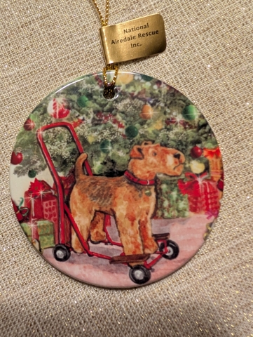 This 2011 limited edition porcelain ornament is an Ann Curran collectable number 67 of 250 and features an Airedale on a cart, titled "Airedale on Wheels".