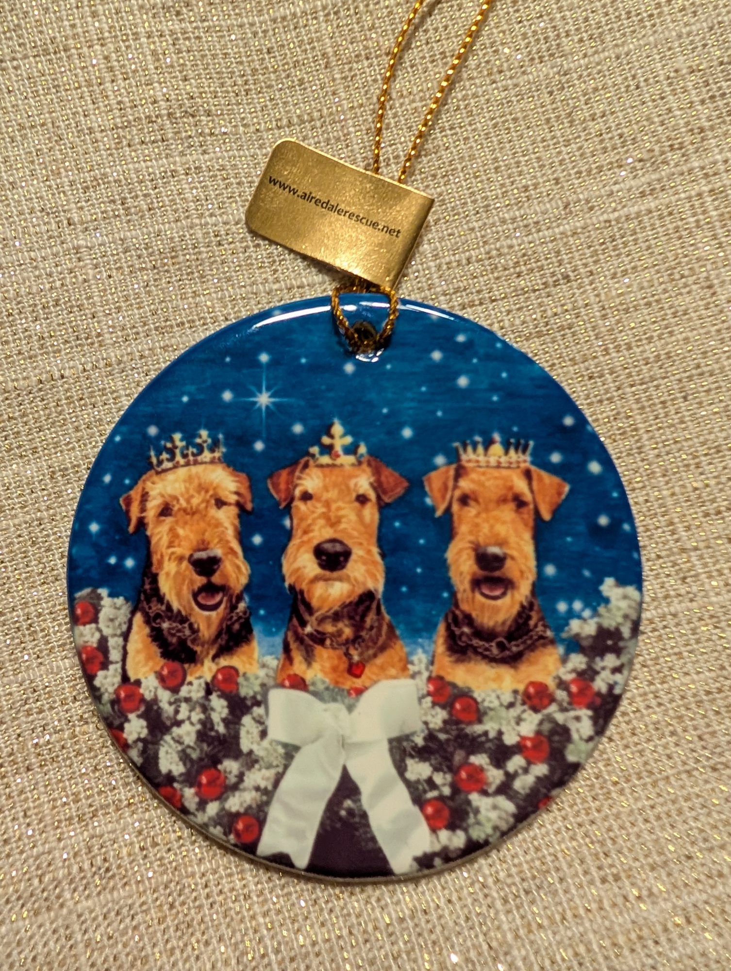 This porcelain 2010 limited edition ornament is number 131 of 250 titled "We Three Kings" and features 3 Airedales , the King of Terriers. It is an Ann Curran design for National Airedale Rescue.