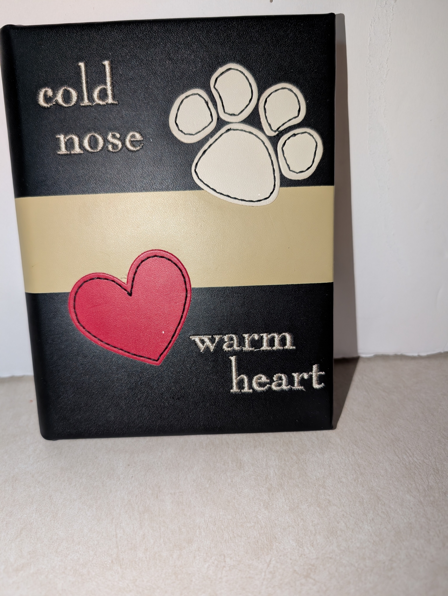Terrific photo album" Cold Nose Warm Heart " to show off pics of your Fur Kids. The album holds 24 pictures measuring 4" by 6" to show friends anytime.