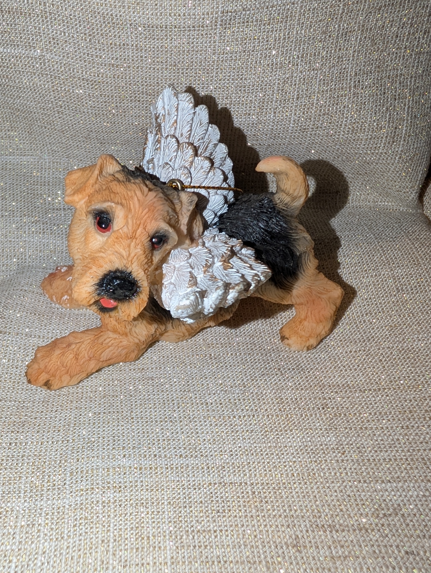 An adorable pose for an Airedale ornament - the play bow. This Angel Airedale is 4" long and 3" tall