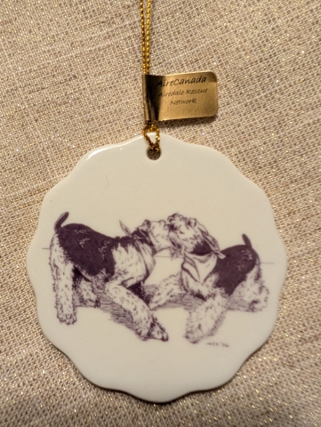 This adorable porcelain 2 inch ornament features 2 playful Airedales on each side. It is an Inez original and was sold originally by AireCanada.