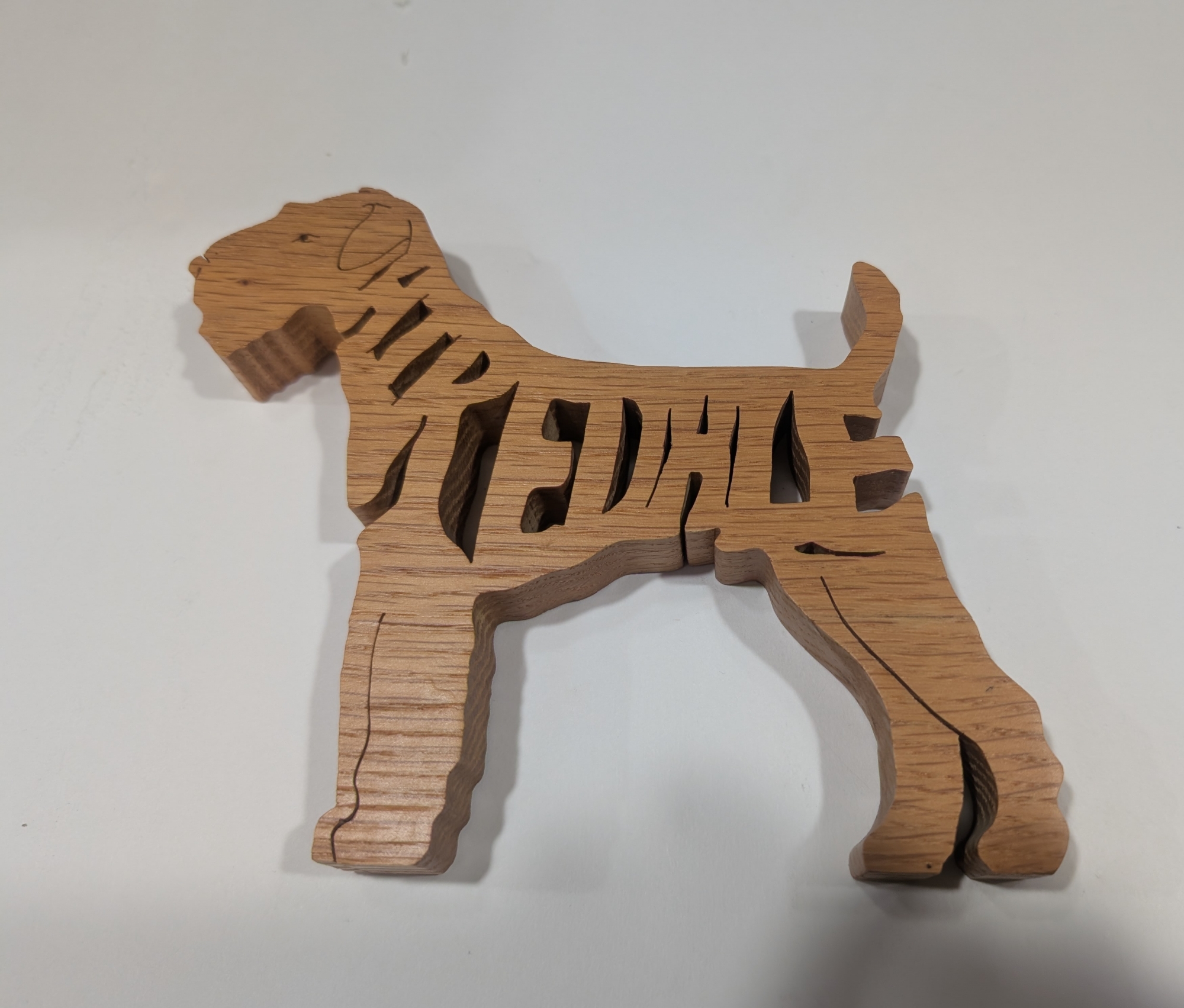 Extremely nice workmanship on this scroll saw Airedale made of wood. Not only is it shaped like an Airedale but the word Airedale is cut into the Airedale. Hight is 5-3/4" by 7" long.