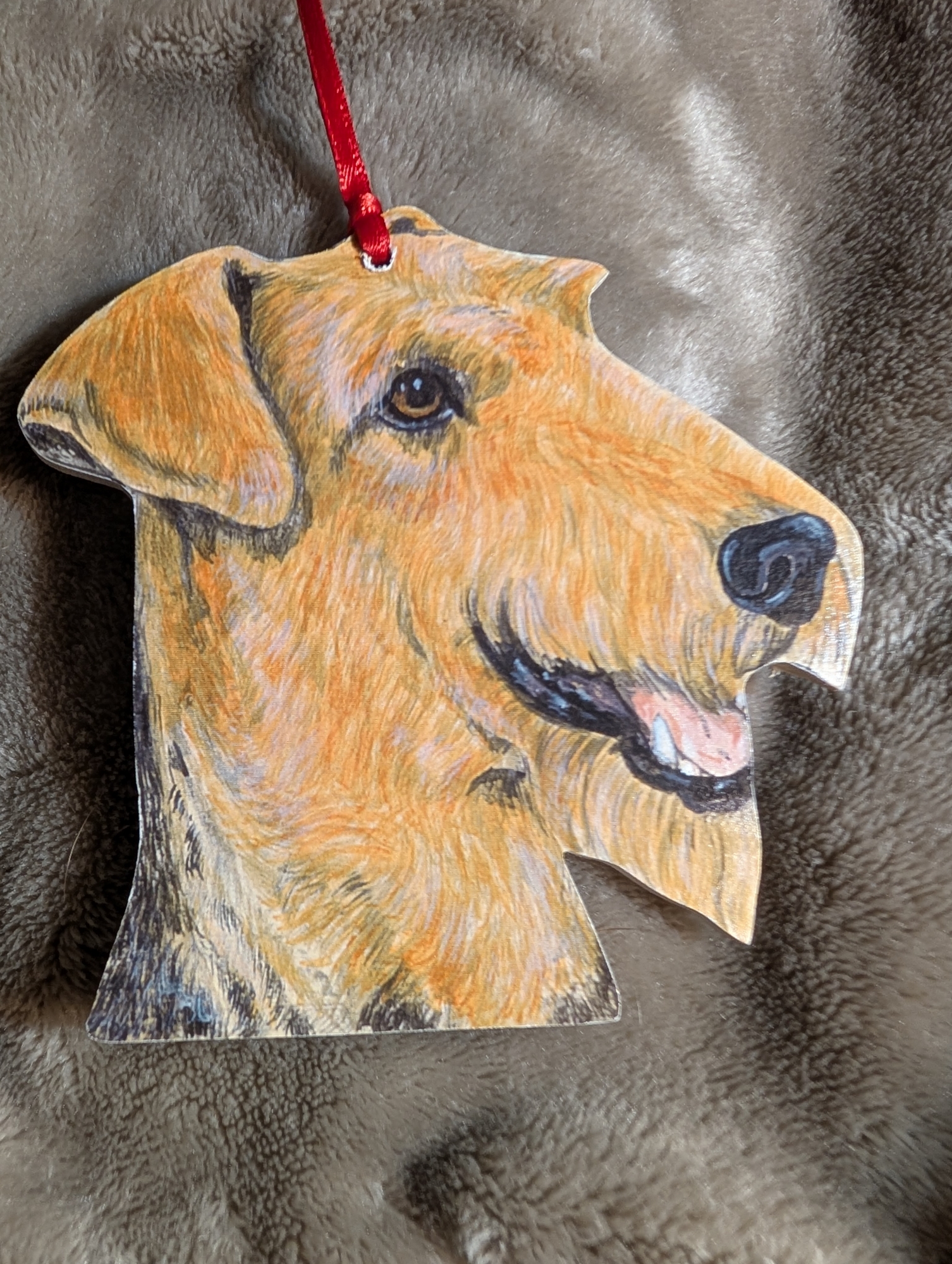 This smiling wooden Airedale ornament could be used on a Christmas tree and bring smiles. It is 3-1/2" tall by 4" wide.