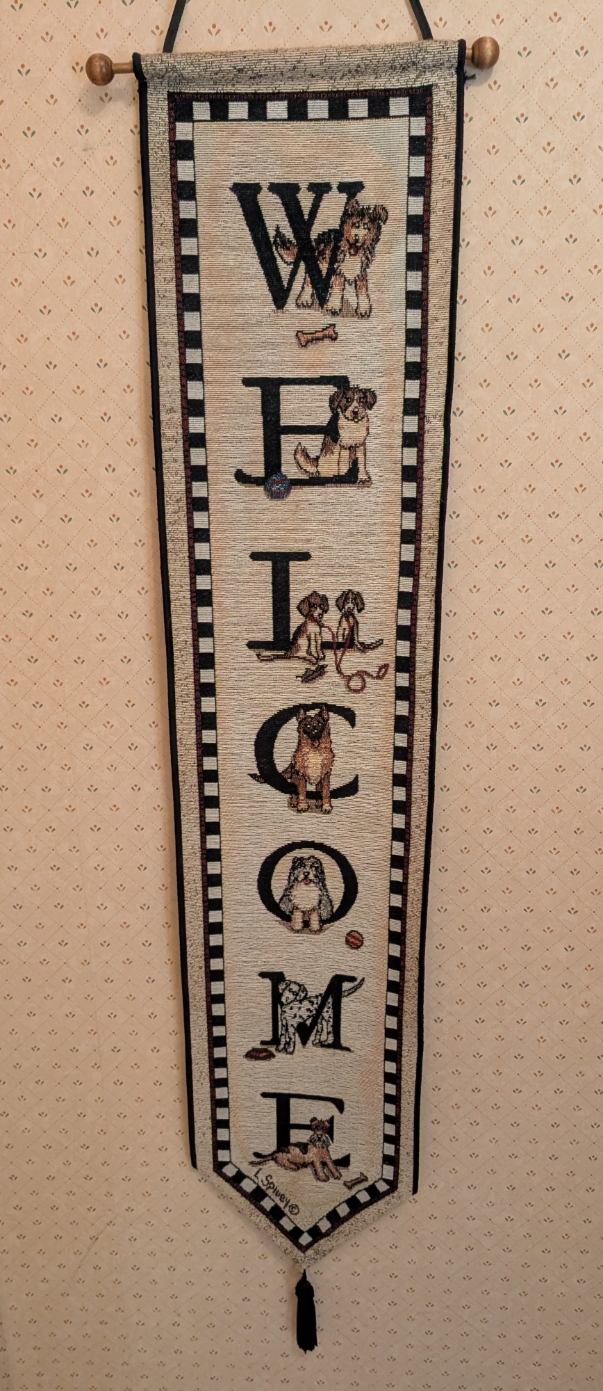 What can make guests feel more welcome than this tapestry with dogs on it? An Airedale, Collie , Dalmation and more breeds grace this hanging. It's a beautiful gift for a dog lover or yourself. This welcome tapestry measures a large 3 feet and 10 inches long and 9 inches wide.