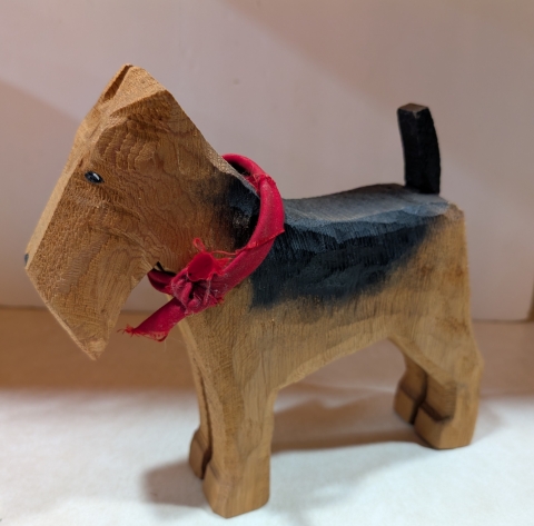 Wonderful piece to add to a collection or as a gift. This wood carved Airedale, wearing a red scarf, is nicely sized at 9" high and 10" long, 2 inches wide. He's a big Airedale who has a gold heart shaped tag on his tummy stating" Dog Bark Park 2010. Cottonwood, Id. 83522". Unique gift !
