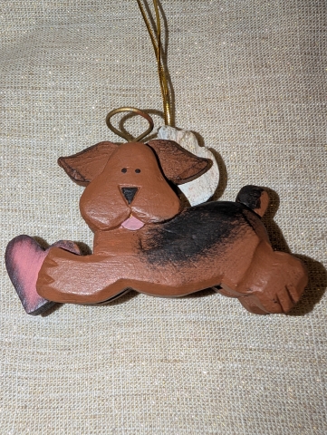 This cute little Airedale Angel is holding a heart and looking to be placed on a Christmas tree. It measures 3-1/2" long, 2-1/2" high and 1" wide .