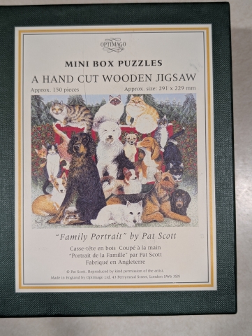 Great gift! This wooden puzzle features cats and dogs, one of which is an Airedale. It was made in England and measures approximately 9" by 11" across.