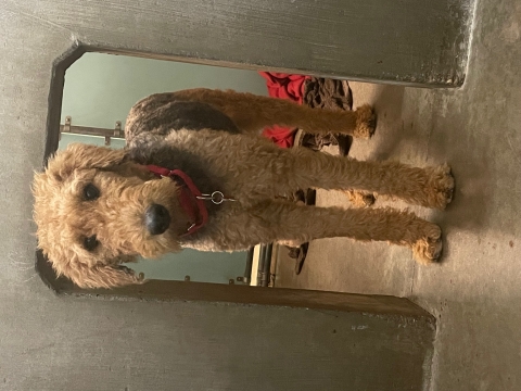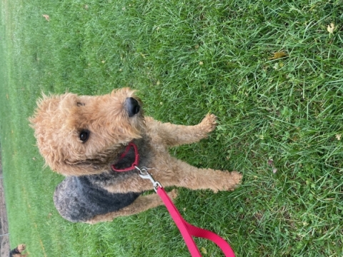 Poppy is a young 40 pound girl with a terribly rough start to her life. Although she was rescued from a hoarding-neglect case with over 15 other dogs, she is a happy-go-lucky girl! Poppy is fearful of people and will take several weeks to warm up to her new adopter. She does like other dogs and enjoys playing with the other Airedale she came into rescue with, Daisy, but cannot play at the moment because she is heartworm positive. She is in her second month of treatment and has not had any issues! Poppy doesn't know her commands very well but is a fast learner and does not have accidents in her kennel. She is a chewer and will need mental stimulation and exercise to keep her chewing at bay. She will also need to continue to be crate trained until she grows out of her chewing. She loves her food and treats. Poppy and her sister Daisy are currently in boarding and are hoping for a soft place to land soon. Poppy would be happy to go to a home with Daisy if possible. Otherwise, having another dog in the home will be a good option as well so she can build some more confidence! Poppy will require a 6 foot fence, preferably privacy as she is a fence climber and can climb chain link.